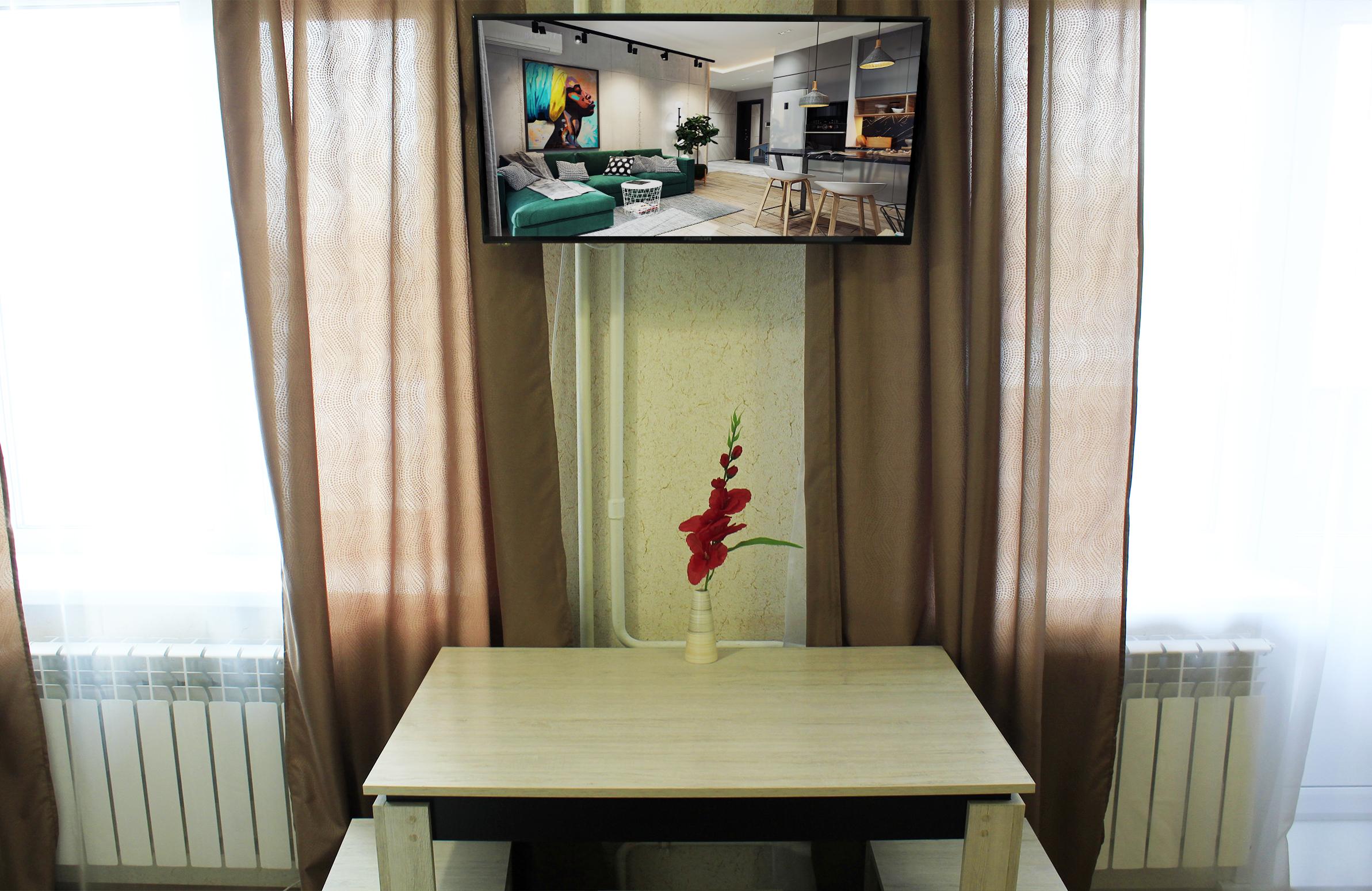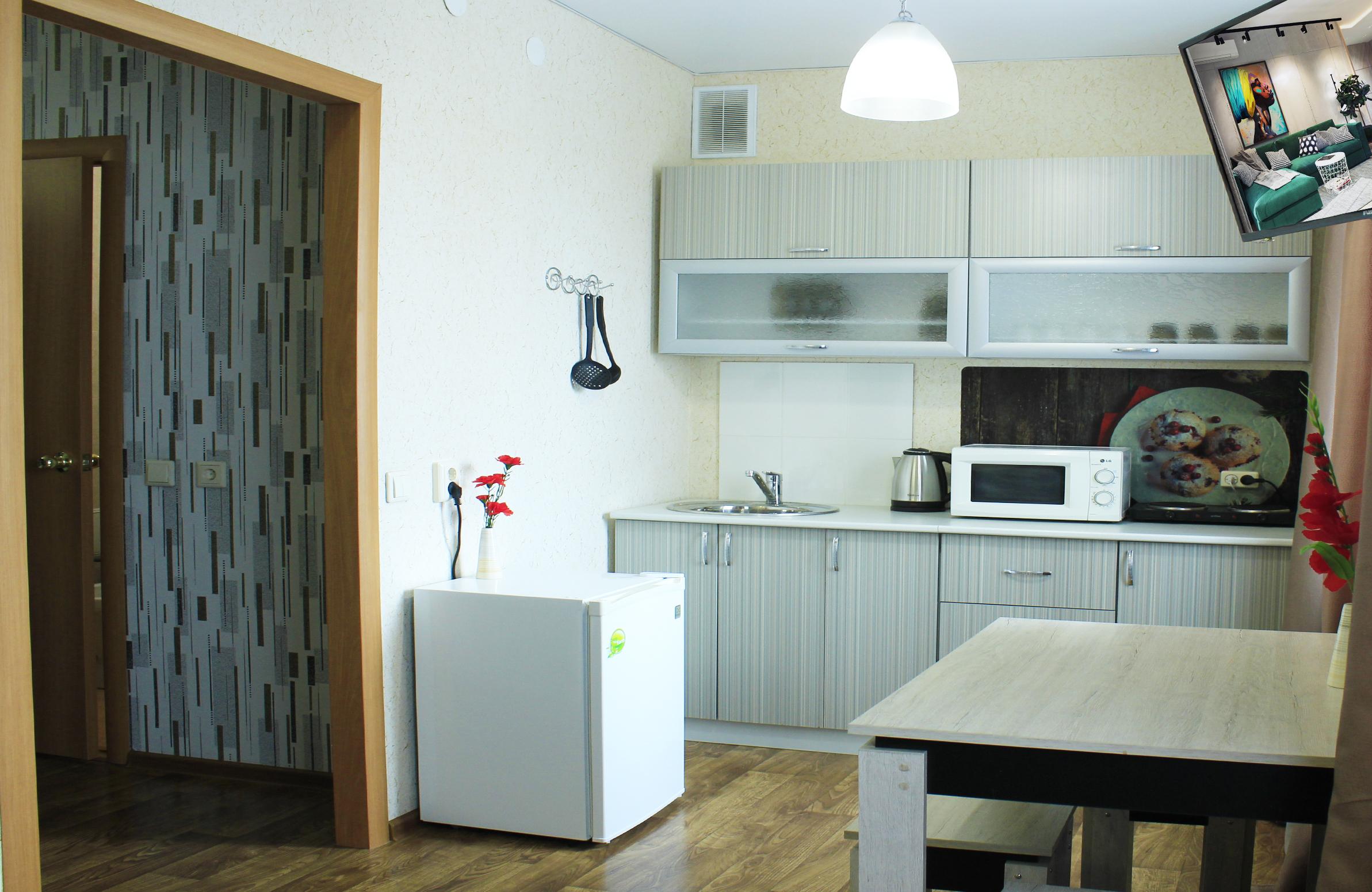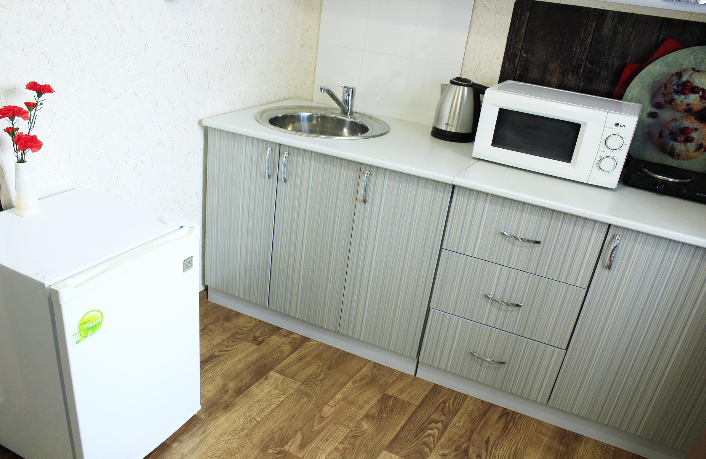 - Оборудование: гладильная доска, духовой шкаф, микроволновая печь, набор посуды, плита электрическая, телевизор, утюг, холодильник, электрочайник